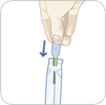 Den mit dem Gel beschichteten Katheter können Sie nun aus der Innenhülle herausschieben. Achten Sie bitte dabei darauf, ihn nicht mit den Händen zu berühren.