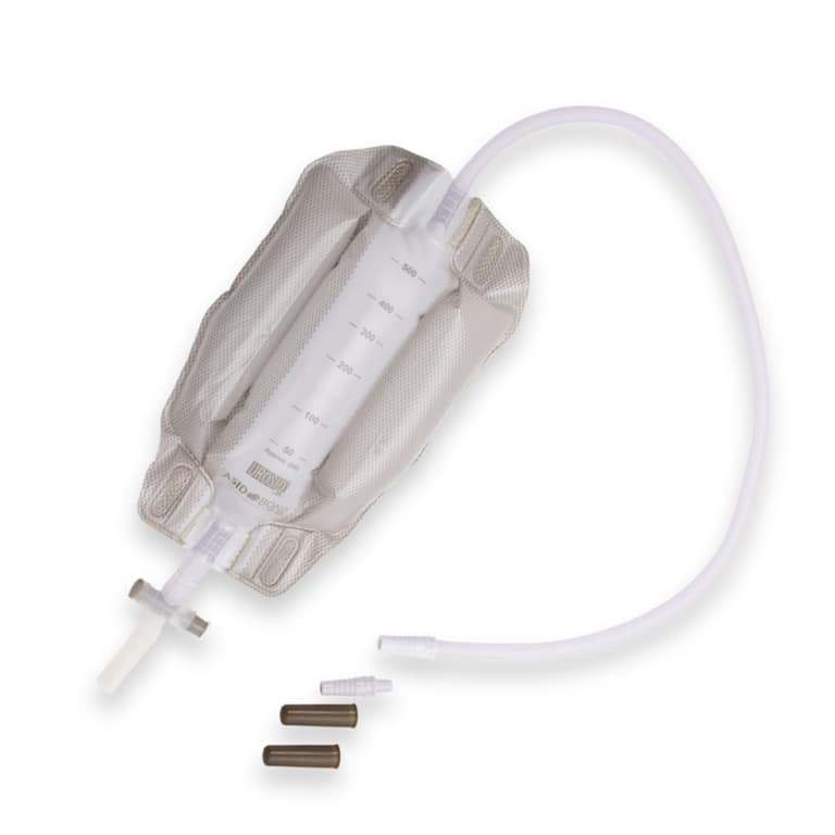 UROMED CYSTOBAG® MINI 500 »SECRET« – steriler Mehrkammer-Beinbeutel – Fassungsvolumen: 500 ml. Schlauchlänge: Wahlweise 12 cm oder 50 cm.